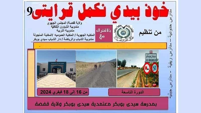 تنتظم جمعية «اكتشف بلادك» الدورة التاسعة لتظاهرة « خوذ بيدي نكمل قرايتي» من 16 إلى 18 فيفري بمدرسة سيدي بوبكر ولاية قفصة .