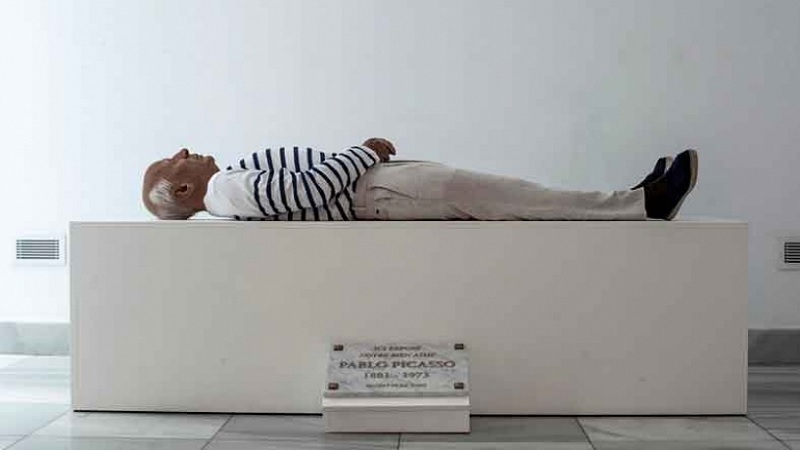 عرض للمرة الأولى تمثال يشبه جثمان الفنان بيكاسو بدلا من لوحاته الفنية، بين ممرات صالة معرض مدريد للفن المعاصر وعرض التمثال وكأن