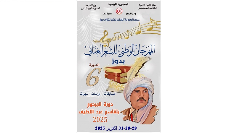 تحتضن مدينة دوز أيام 29-30-31 أكتوبر المهرجان الوطني للشعر الغنائي في دورته السادسة التي تحمل أسم الشاعر الشعبي الراحل بلقاسم عبد اللطيف .واعلنت هيئة المهرجان عن قائمة الشعراء الذين تم قبول نصوصهم وتضم القائمة عددا كبيرا من الشعراء نذكر من بينهم نورالدين بن عبد اللطيف وبية العبار وميلا العياري وسعاد اليوسفي وفوزي بوقطف وجمال بن عيسى والناصر الشايب وغيرهم . ويتوزع الشعراء تقريبا على كامل ولايات الجمهورية يتنافسون على جوائز المهرجان ويتضمن البرنامج مجموعة من الفقرات إلى جانب المسابقة منها محاضرة حول حضور الشاعر بلقاسم عبد اللطيف في المدونة الشعرية التونسية