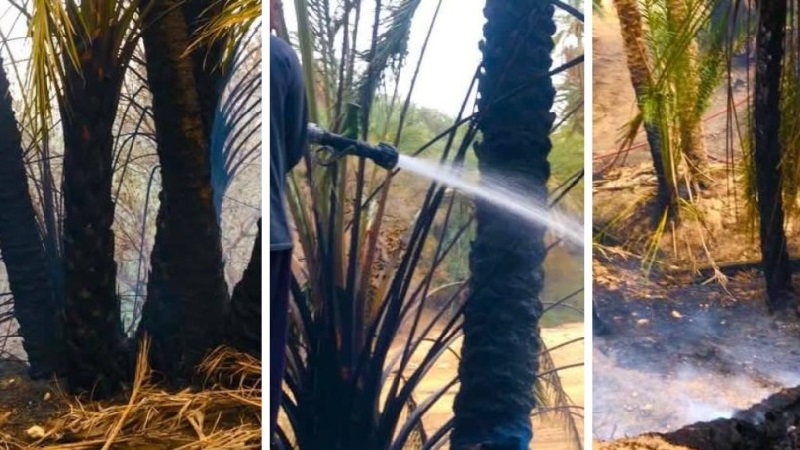 شب مساء اليوم السبت 15 مارس 2025 حريق بواحة تمغزة بالمحاذاة مع الشلال الصغير أتى على مساحة هامة من غراسات النخيل.