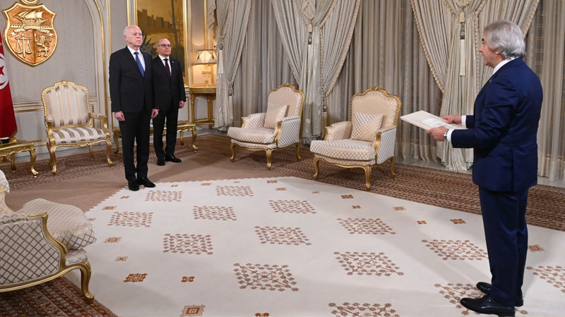 إشراف رئيس الجمهورية قيس سعيّد، صباح اليوم الجمعة 22 مارس 2024 بقصر قرطاج، على موكب تسلّم أوراق اعتماد سفيرين جديدين معتمدين بت