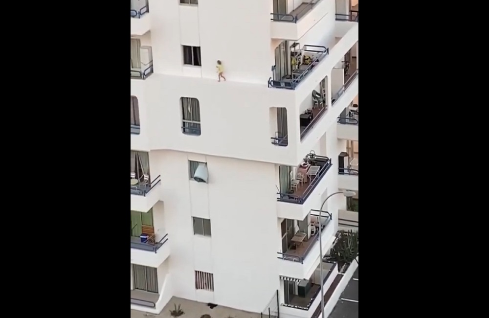 رصد مقطع فيديو، مشهدا صادما لطفلة صغيرة تسير على حافة بناية شاهقة الارتفاع، معرضة نفسها لخطر الموت.
