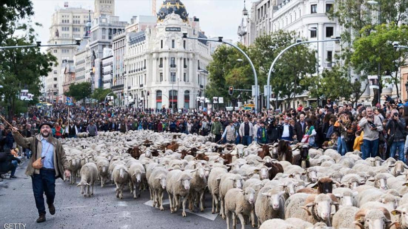 احتلت الأغنام شوارع العاصمة الإسبانية مدريد، امس الأحد، حيث ساق الرعاة قطعانهم من الأغنام والماعز في قلب المدينة، مارين بمسارات