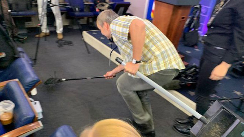 فوجئ أحد المراسلين الصحفيين في البيت الأبيض بسقوط فأر من السقف عليه، يوم الثلاثاء.