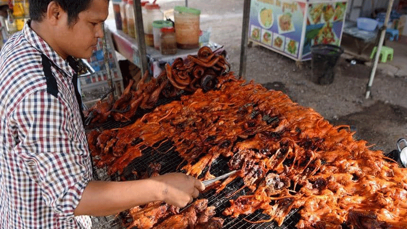 بالقرب من باتامبانغ في كمبوديا، تُشوى عشرات الفئران المتبلة ببطء على الفحم، وهي وجبة تلقى إقبالا كبيرا من السكان المحليين نظرا