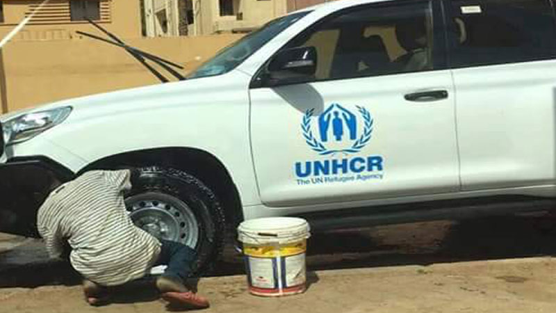تداول نشطاء مواقع التواصل الاجتماعي صورة لطفل سوداني وهو يقوم بتنظيف سيارة تابعة لهيئة منظمة الأمم المتحدة لرعاية شؤون اللاجئين