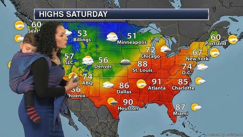 أظهر مقطع فيديو طريف، مقدمة النشرة الجوية الأمريكية ''سوزي مارتن'' وهي تقدم النشرة حاملة ابنها على ظهرها الذي غلبه النوم طوال ا