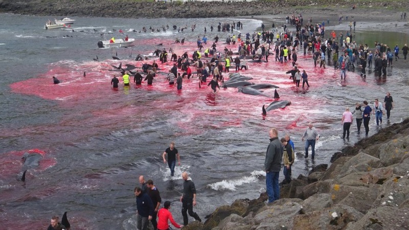 انتشرت صور صادمة توثق حادثة قتل عشرات الحيتان المسالمة على شواطئ الدنمارك، والتي حولت مياه البحر من ال