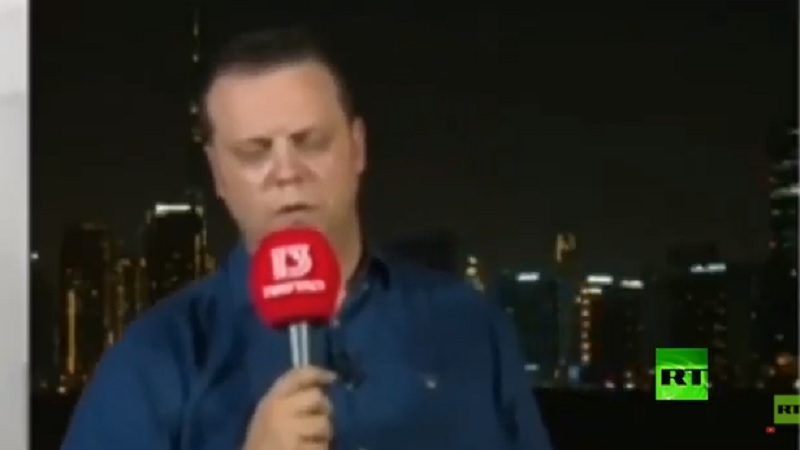 تداول مستخدمو مواقع التواصل الاجتماعي مقطع فيديو لحظة سقوط مراسل قناة إسرائيلية مغشيا عليه خلال بث مباشر من دبي.