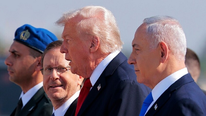 واستقبل رئيس وزراء دولة الاحتلال بنيامين نتنياهو والرئيس إسحاق هرتسوغ ترامب رسميًا في مطار بن غوريون.