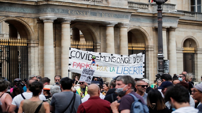 أفادت إذاعة "France Info" بأن أكثر من 150 مدينة فرنسية تشهد اليوم السبت مظاهرات في إطار اليوم الوطني للاحتجاج على الإجراءات الصحية الجديدة التي فرضتها السلطات بسبب جائحة كورونا. وأثار مشروع القانون القاضي بالتلقيح الإلزامي لعمال المستشفيات، وتوسيع نطاق استخدام الشهادات الصحية، الذي صدق عليه برلمان البلاد في 5 أغسطس الجاري، استياء في المجتمع الفرنسي، ووفقا للقانون الجديد لن تكون من الممكن زيارة المطاعم والمراكز التجارية الكبيرة والحفلات الموسيقية والمسارح، دون إبراز الشهادات الصحية.