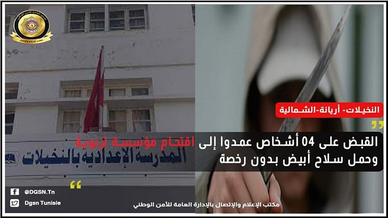 أريانة: القبض على 04 أشخاص اقتحموا مؤسسة تربوية حاملين سلاح أبيض