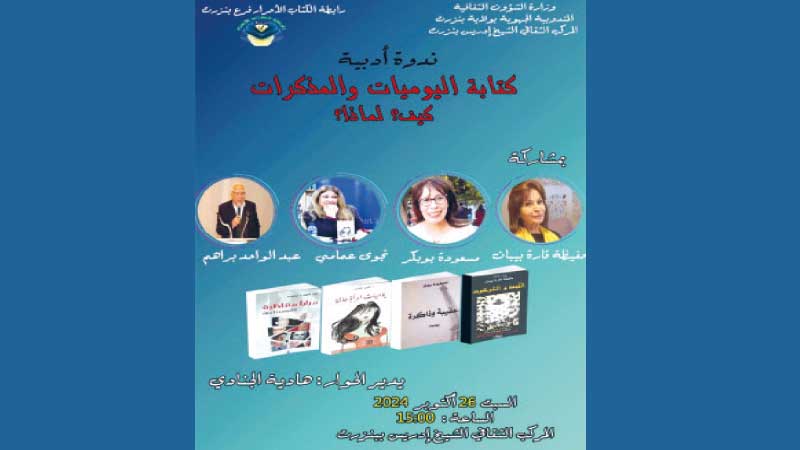 تنظم رابطة الكتّاب الأحرار فرع بنزرت ، بالتعاون مع المركّب الثقافي الشّيخ إدريس بالجهة مساء السبت 26 أكتوبر الجاري، ندوة أدبية حول « كتابة اليوميات والمذكّرات : كيف ولماذا؟ « بمقرّ المركّب ، وذلك بمشاركة الكتّاب عبد الواحد براهم ،مسعودة بوبكر ، حفيظة قارة بيبان، ونجوى عمامي ...