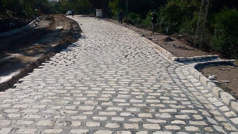 تقدم انجاز مشروع تبليط مسلك الحصن الجنوي بطبرقة باستعمال الحجارة مع المكونات الطبيعية والأثرية لل